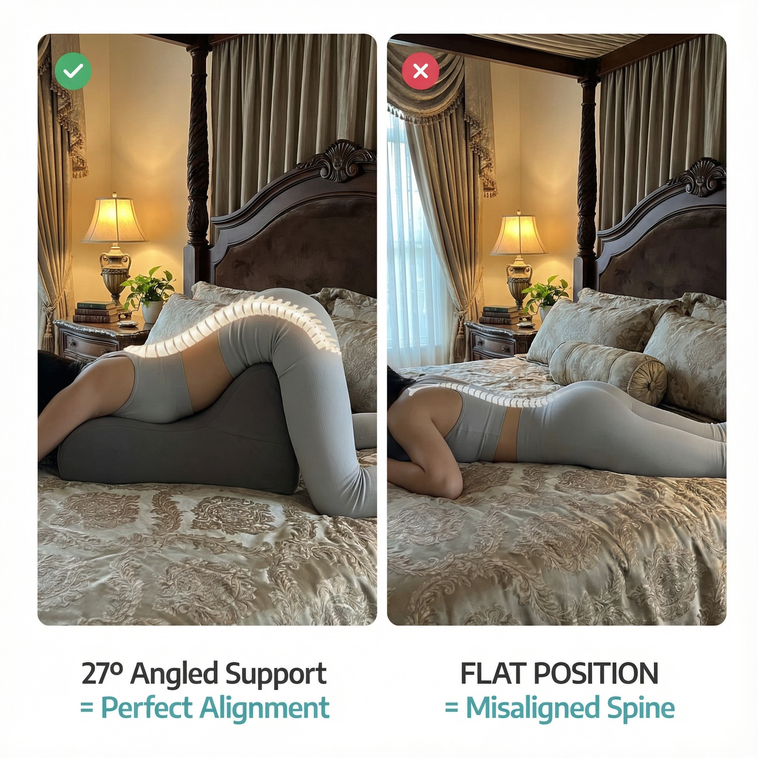 Designed at a precise 27° angle, the pillow naturally aligns your body for optimal comfort and control while evenly distributing pressure to reduce hip and lower back strain. Its self-positioning design does the work for you—no constant adjusting needed. Discreet and supportive, it blends seamlessly into your bed as a simple posture cushion.